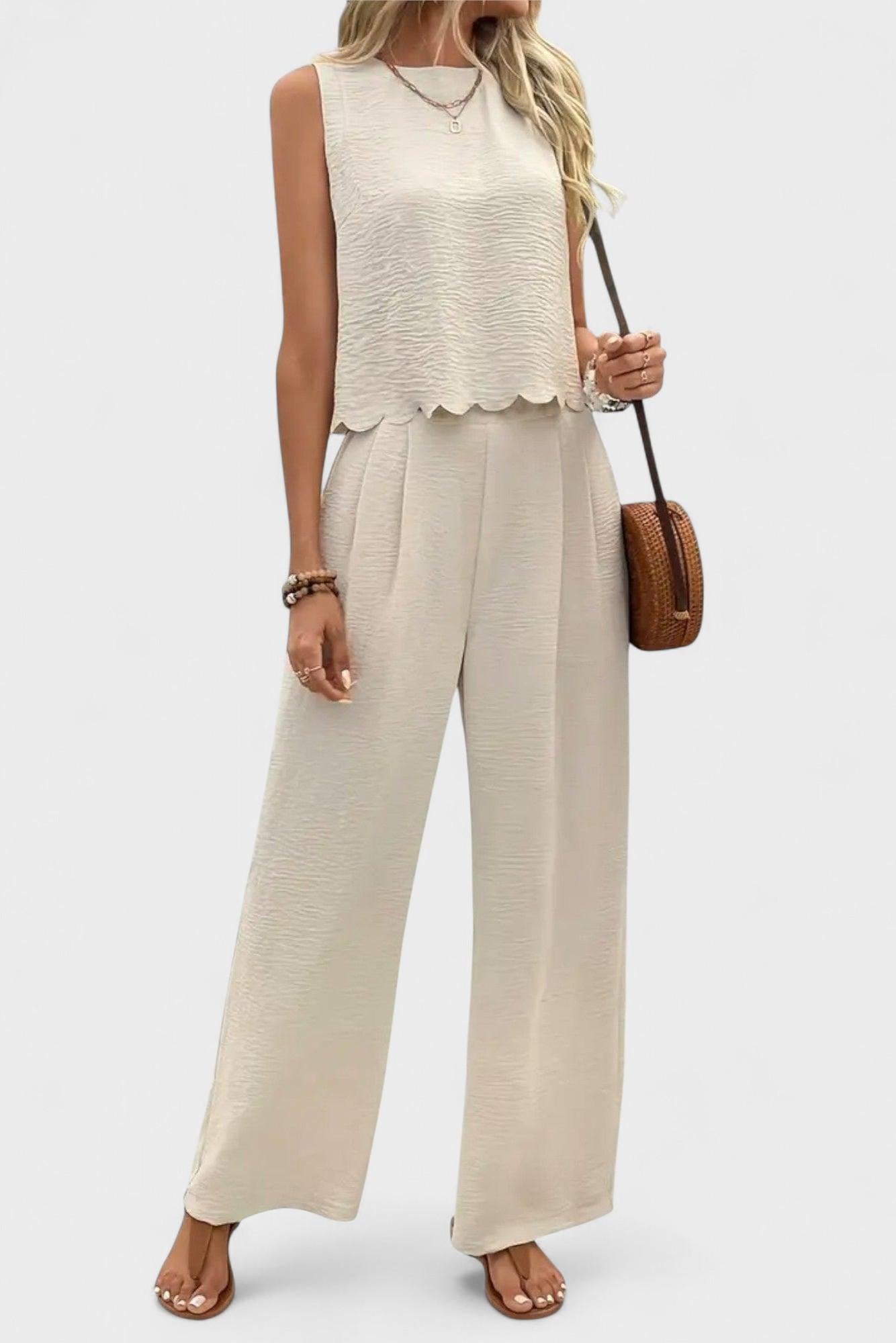 Clara | Ærmeløst sæt udstråler ren, sofistikeret friskhed til varme dage og byens lys. Med et let snit og et behageligt stof fremstår det elegant uden besvær, og den tidløse silhuet gør Clara til en garderobeinvestering, der bærer gennem sæsoner. Håndværket kommer tydeligt til udtryk i hver søm, hvilket signalerer en gennemført kvalitet og omtanke i designet. Sættet afspejler arven for præcision gennem materialer af høj standard og solid konstruktion. Den velafstemte balance mellem komfort, elegance og varig værdi gør Clara til et klassisk valg for den stilbevidste samler og den moderne garderobe, der søger tidløs elegance uden at gå på kompromis.