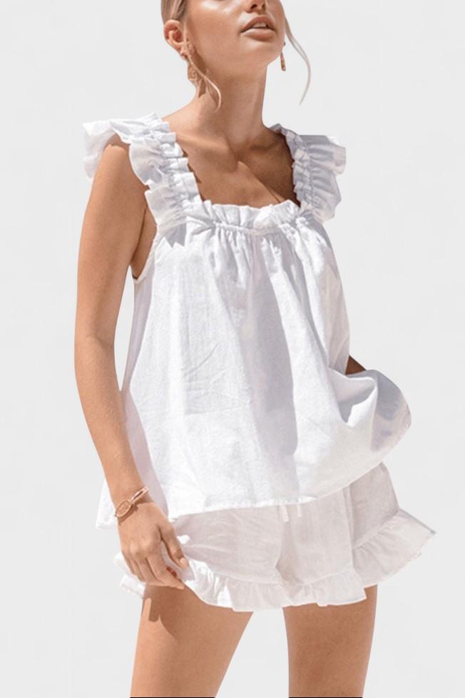 - Design og silhuet: Flæser på toppen og flæsekant på shorts skaber en let, feminin silhuet.