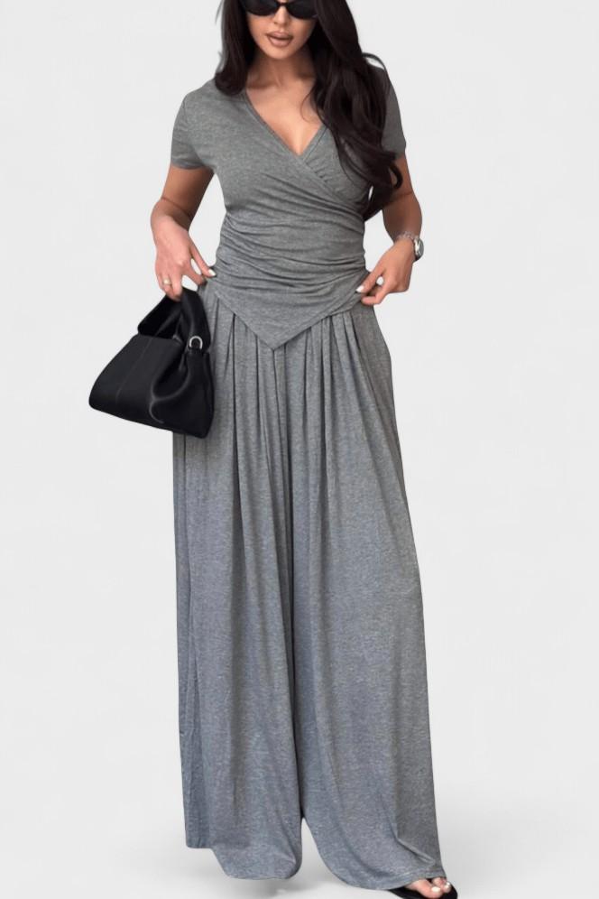 Ruslana | Sæt udstråler moderne komfort med en feminin nuance og tydelig håndværksmæssig omtanke. Den rene silhuet tilpasser sig kroppen, bindetop fremhæver taljen, og en V-formet halsudskæring slanker dékolletagen. De brede, løse bukser giver bevægelsesfrihed og en let, flydende silhuet hele dagen. Det lette, alsidige stof gør sættet særligt velegnet gennem forår, sommer og efterår og bevarer form og komfort. Begrænset tilgængelighed understreger eksklusivitet uden at gå på kompromis med bæredygtigheden, mens arven af klassisk design giver en tidsløs kvalitet, der appellerer til den kræsne forbruger og samleren.