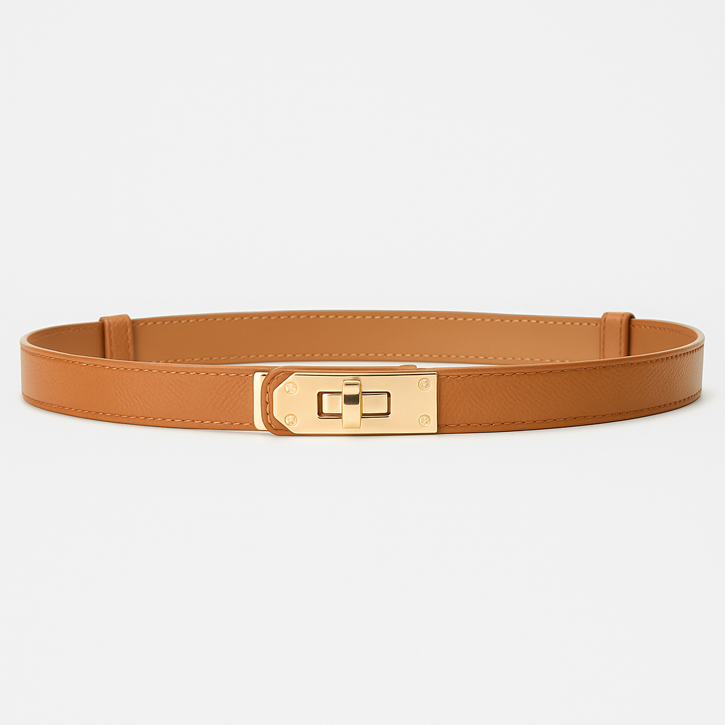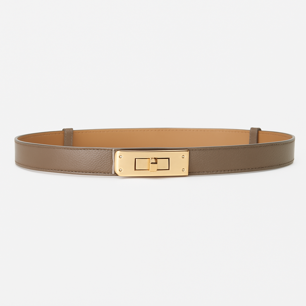 Minimal lines meet polished detail. This waist belt balances clean structure with a distinctive twist-lock clasp in gold-tone metal. Designed to cinch softly at the waist, it adds instant definition and understated elegance—whether styled over a dress or layered with tailoring.